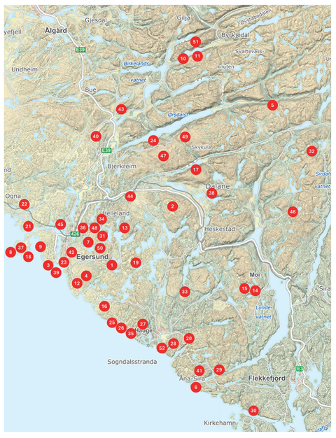 52 turmål i Eigersund, Bjerkreim, Lund, Sokndal og Flekkefjord